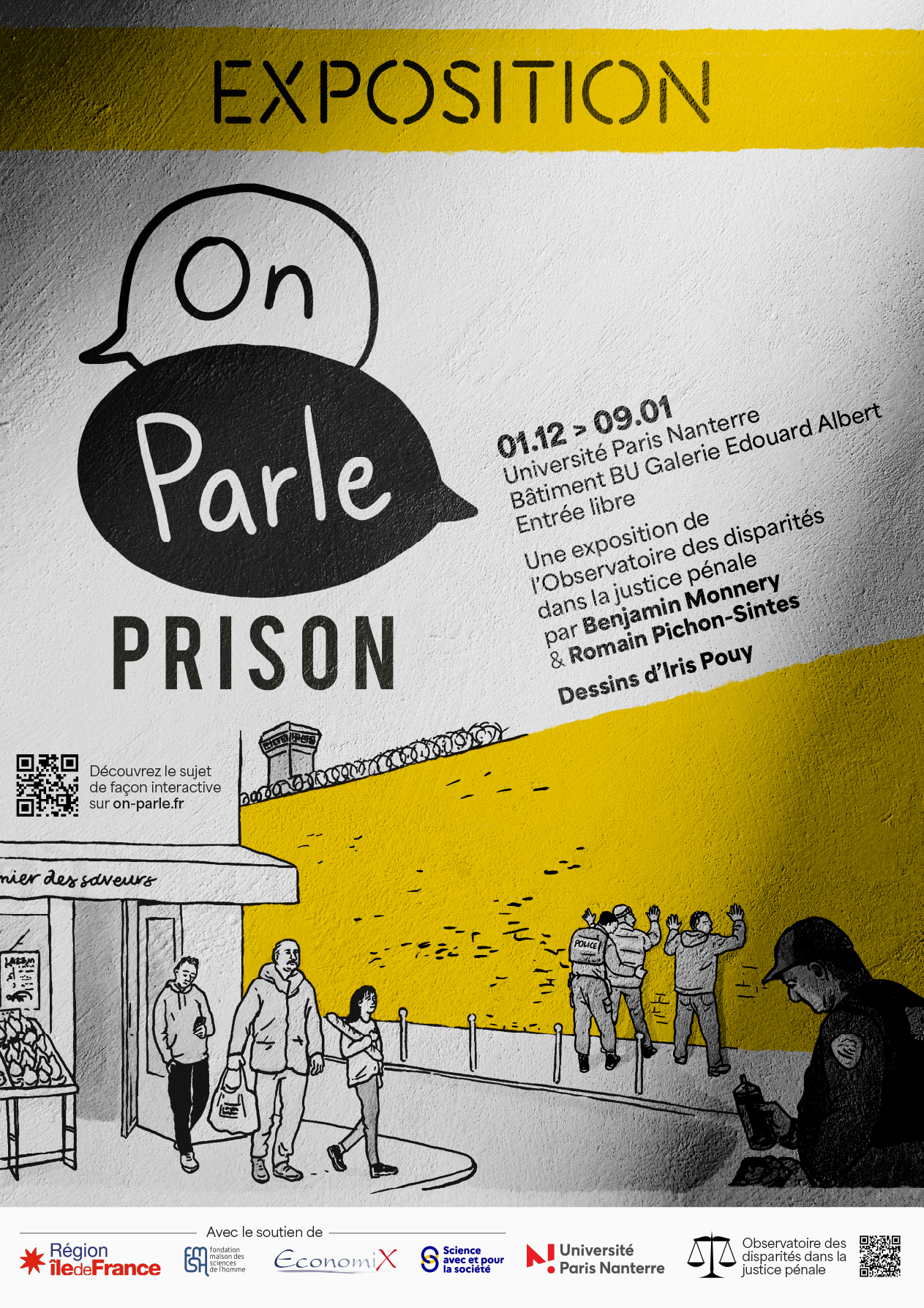 « On parle prison » est une exposition de l'Observatoire des disparités dans la justice pénale par Benjamin Monnery et Romain Pichon-Sintes, et les dessins d’Iris Pouy. Un vernissage de l'exposition a lieu le mardi 2 décembre à 18h.