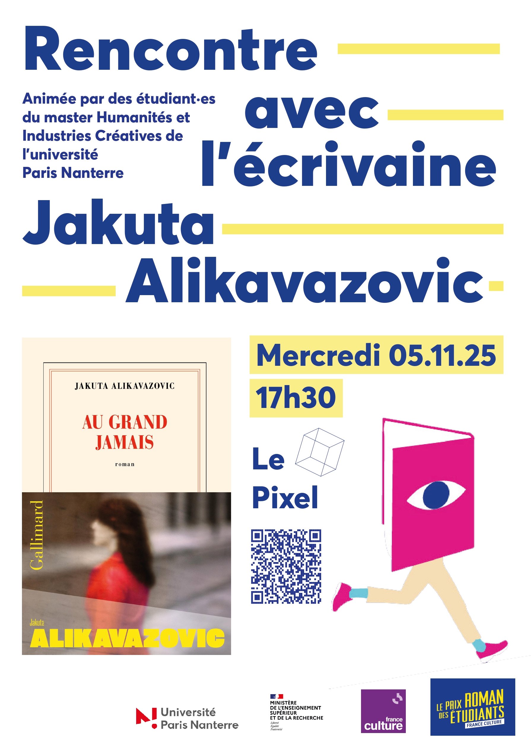 Dans le cadre du Prix du Roman Étudiant, les étudiant·es du master Humanités et Industries Créatives vous invitent à une rencontre avec Jakuta Alikavazovic, pour nous parler de son livre "Au grand jamais" (Gallimard), à 17h30, au Pixel.