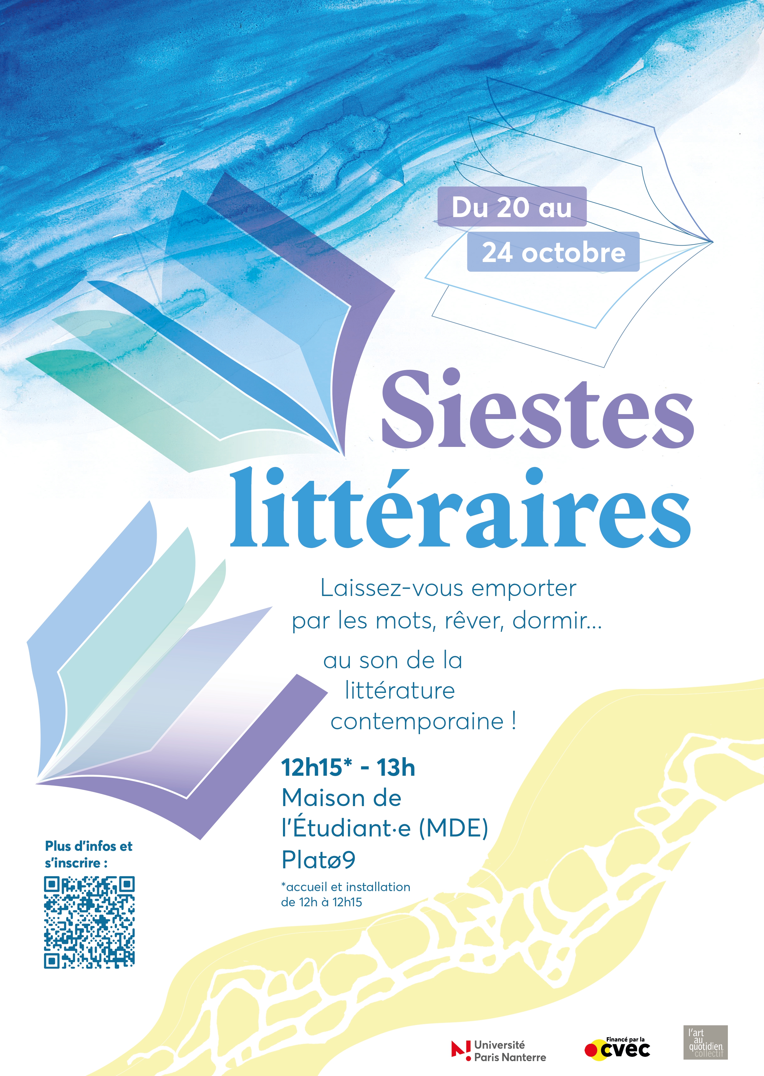 Du 20 au 24 octobre, chaque midi, entre 12h15 et 13h, la comédienne Sophie Maillard lit à haute voix des auteurs et autrices contemporaines, à un auditoire confortablement allongé, dans la pénombre (Maison de l'étudiant•e - Platø9). Alors laissez-vous emporter par les mots, rêver... et peut-être dormir ! Sur inscription.
