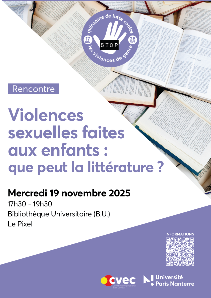 Organisée en lien avec la Journée internationale des droits de l'enfant, cette rencontre vise à éclairer en quoi la littérature prenant pour sujet les violences sexuelles faites aux enfants peut informer nos représentations individuelles et collectives en la matière voire être le vecteur de changements sociaux (culturels, législatifs, institutionnels…).