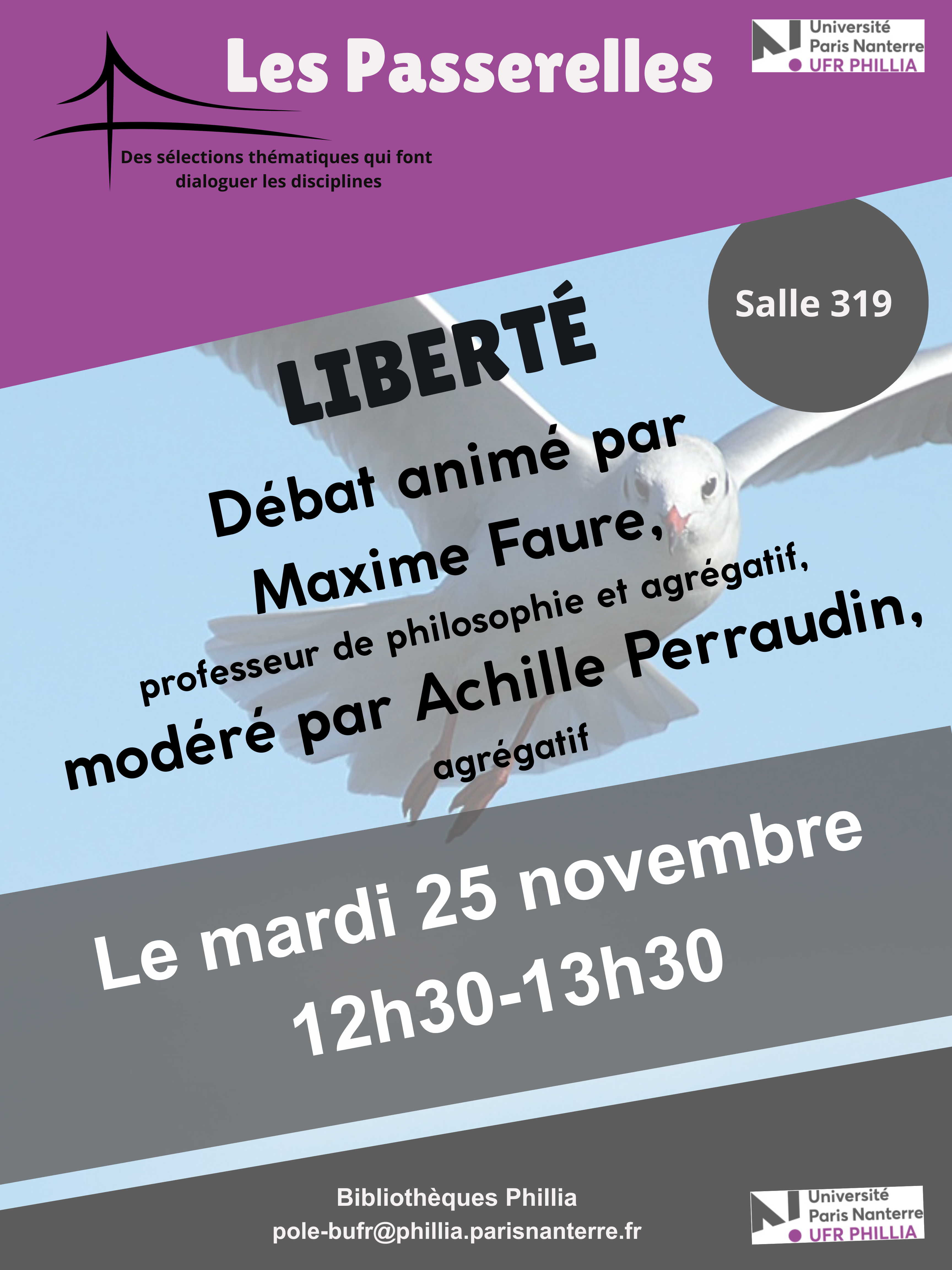 Les bibliothèques de l'UFR PHILLIA organisent Les Passerelles du mois de novembre autour de la notion de liberté en philosophie. Un débat est proposé sur ce thème, animé par Maxime Faure, professeur de philosophie et agrégatif. Modéré par Achille Perraudin, agrégatif.