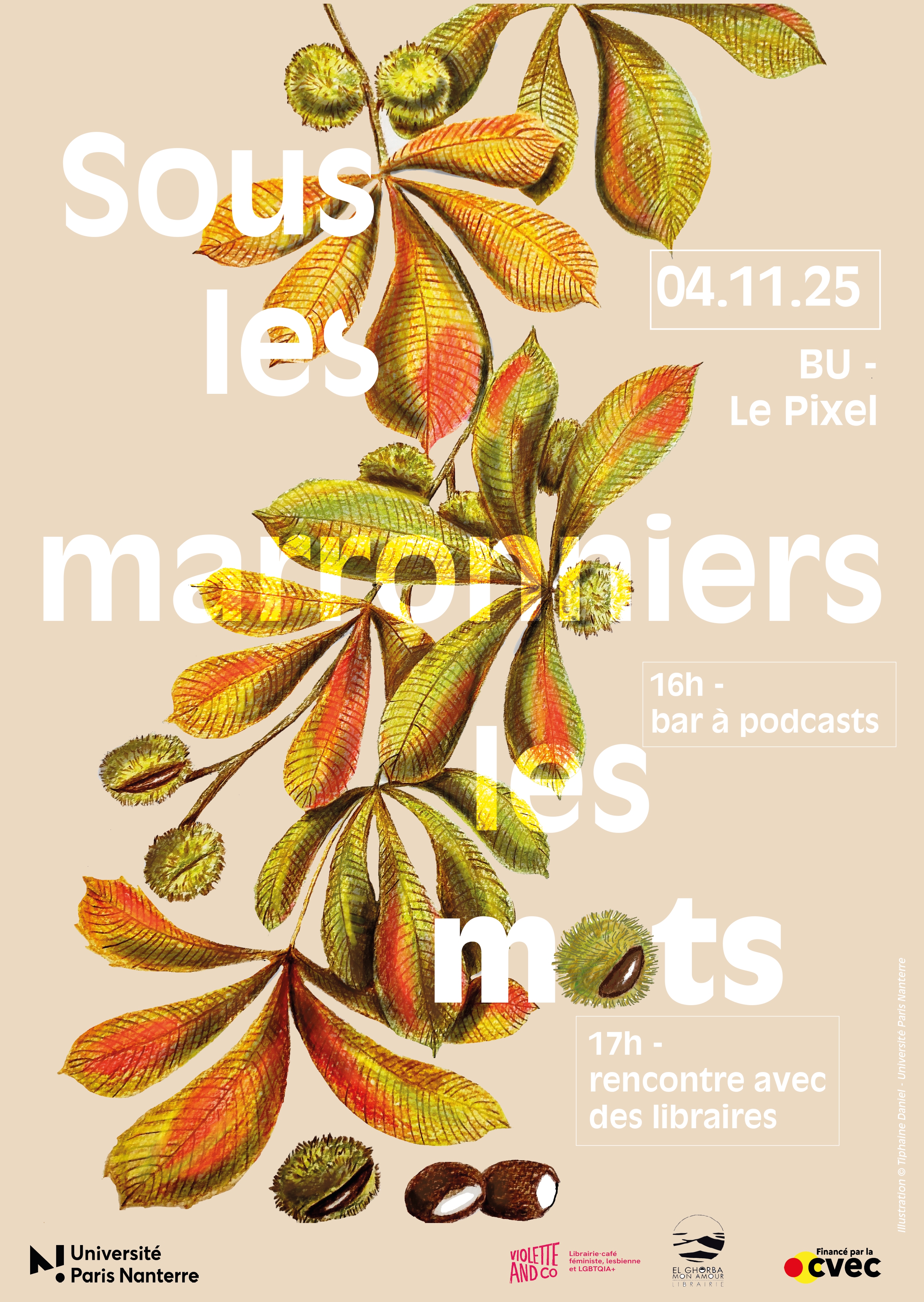 Sous les marronniers, les mots ! L'automne est le temps de la rentrée littéraire, des prix littéraires, etc. mais aussi une formidable occasion de (re)découvrir des auteurs et des autrices contemporaines. Cet événement s'articule en deux temps : une rencontre avec des libraires, un bar à podcasts littéraires. Il est conçu et organisé par les étudiants et étudiantes du master 2 métiers du livre et de l'édition - parcours bibliothèque - Université Paris Nanterre, avec les bibliothèques universitaires. La rencontre est animée par Anna Todorovitch, étudiante en master 2 métiers du livre et de l'édition - parcours bibliothèque - Université Paris-Nanterre.