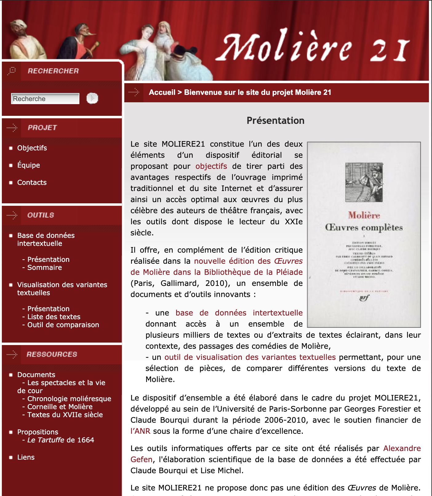 Ce site présente un programme de recherche internationale en humanités numériques qui est le fruit d'une collaboration entre la Comédie-Française, l'Université Paris Nanterre (laboratoire HAR), le MIT, les universités de NYU, de Rouen, de la Sorbonne et de Victoria (Canada). Le programme exploite les données de plus de 110 000 images, 35 000 représentations décrites, 700 000 données pour comprendre la vie théâtrale sous l’Ancien Régime.