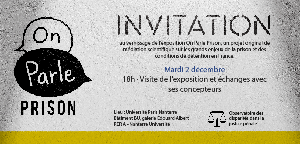 « On parle prison » est une exposition de l'Observatoire des disparités dans la justice pénale par Benjamin Monnery et Romain Pichon-Sintes, et les dessins d’Iris Pouy. Un vernissage de l'exposition a lieu le mardi 2 décembre à 18h.